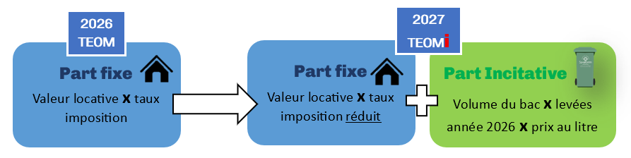 ➔ 2027 = TEOMi = Taxe Enlèvement des Ordures Ménagères incitative = part fixe (valeur locative x taux d’imposition réduit) + part variable (volume du bac x nombre de levées de l’année 2026 x prix au litre).